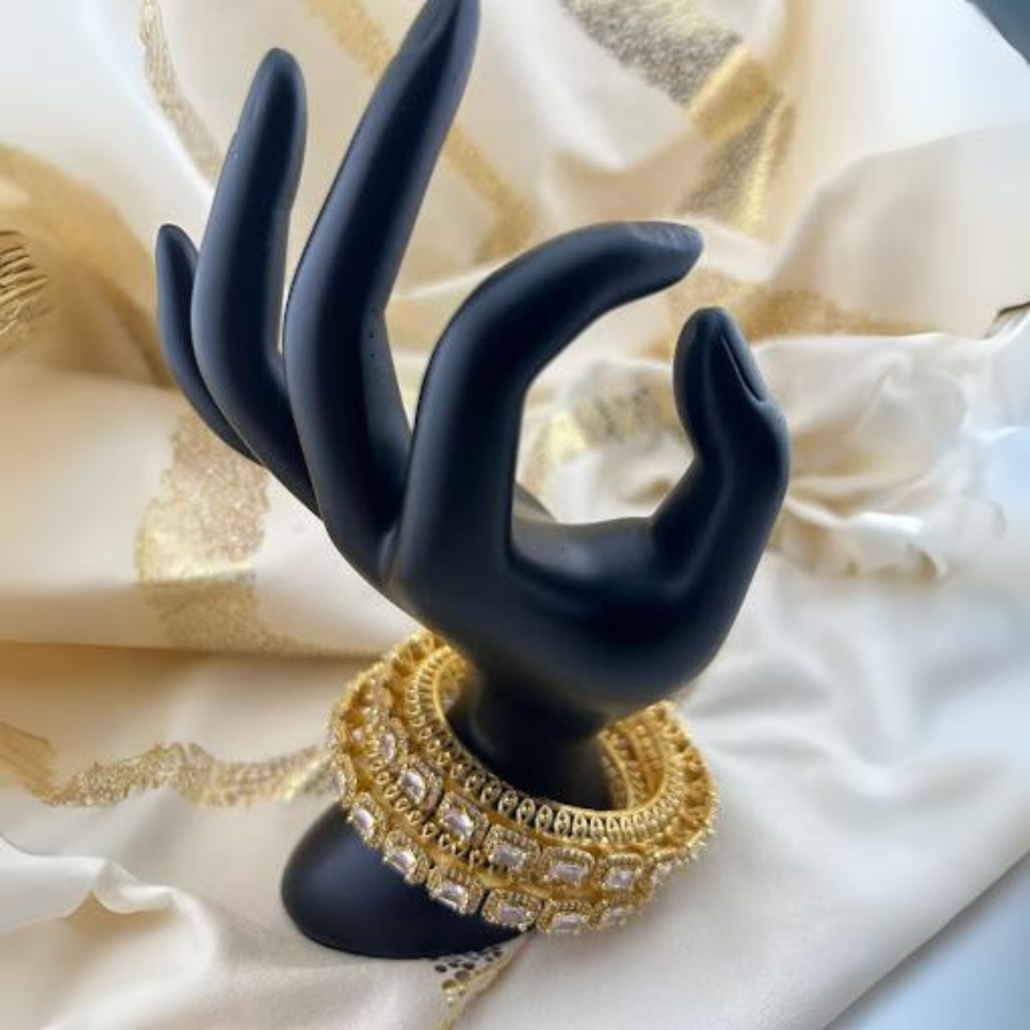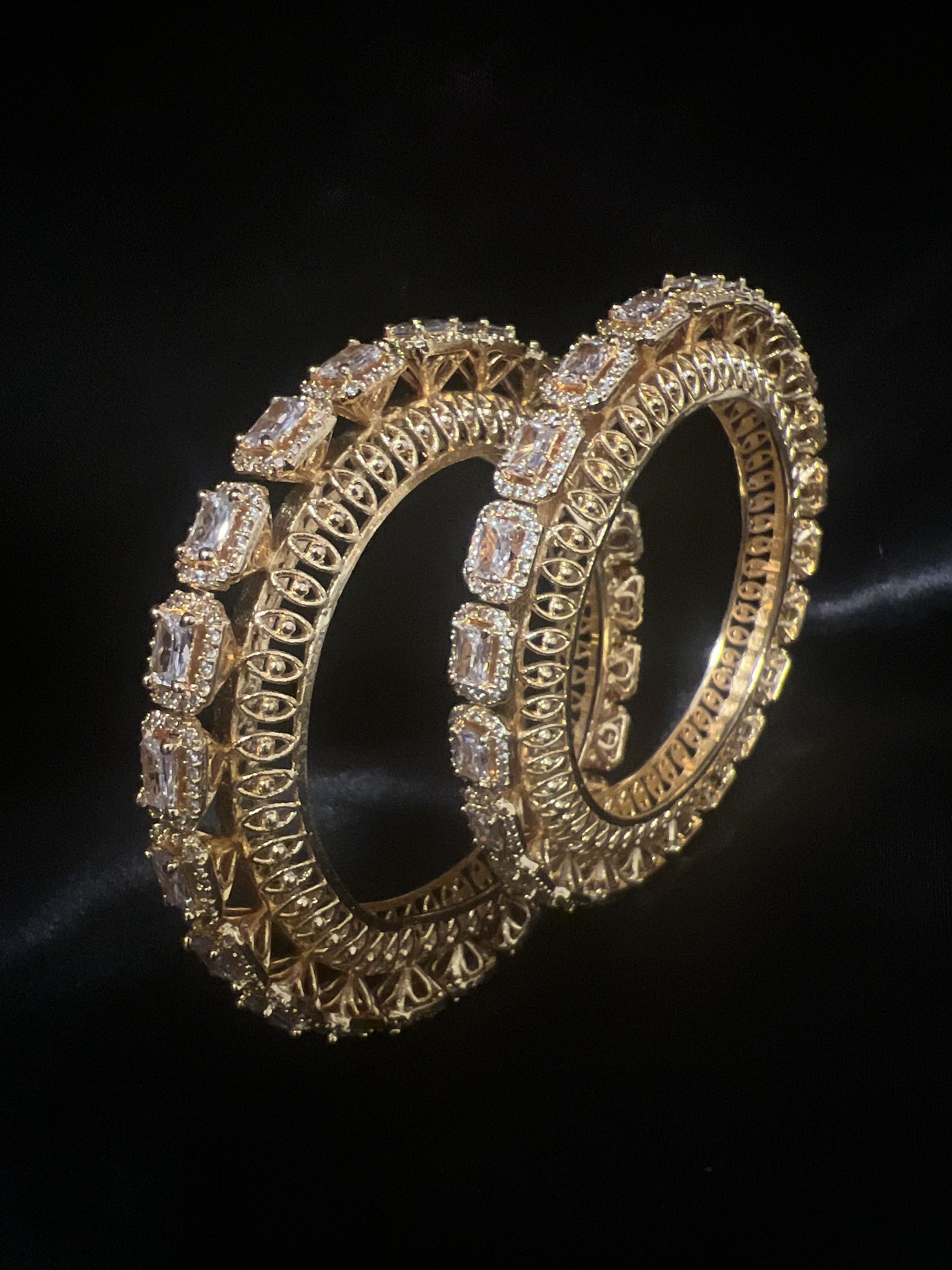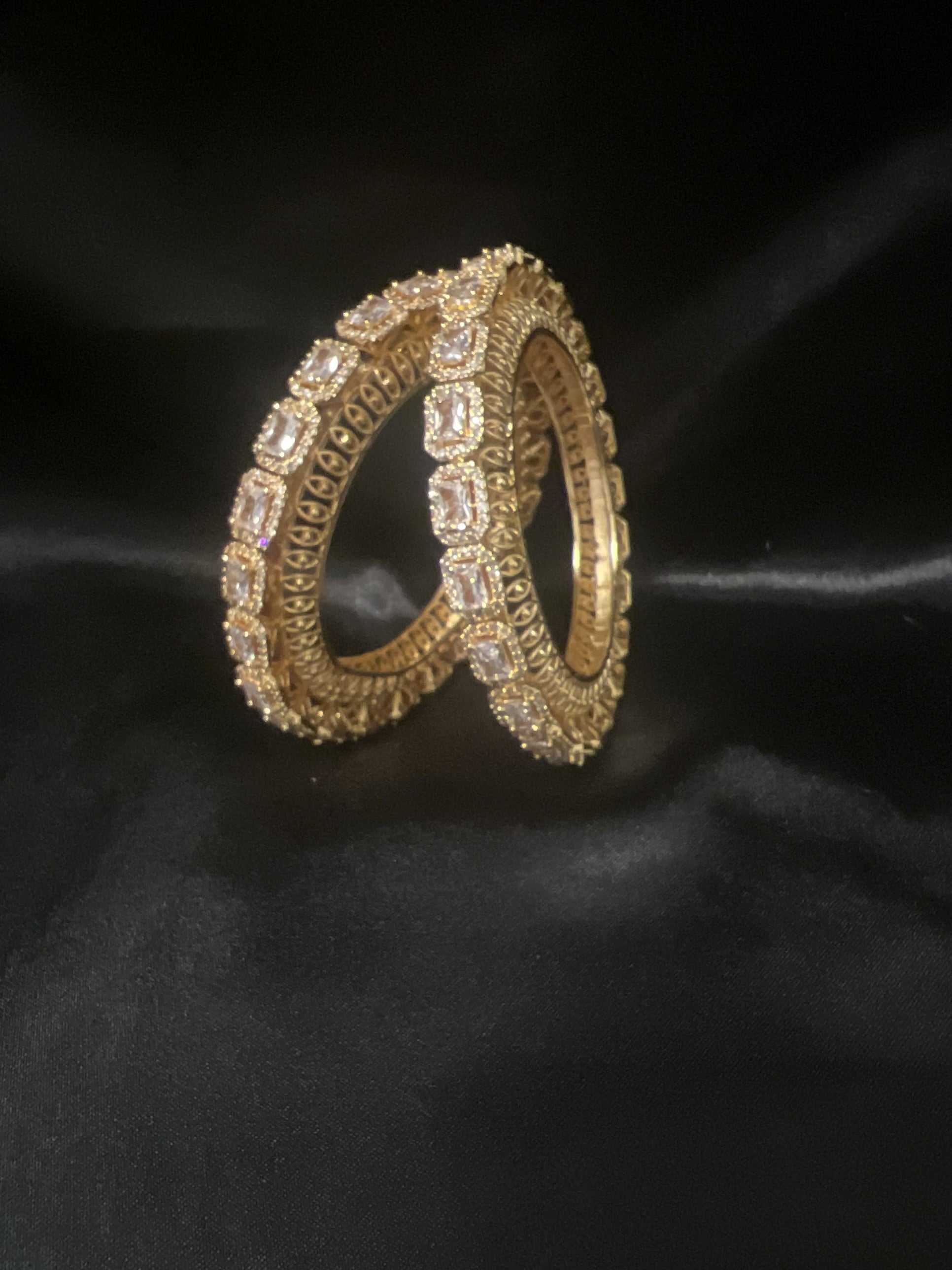 - Adorn your wrist with sophistication through this captivating Indian bridal bangle featuring radiant white gemstones set in lustrous gold color. It is meticulously crafted to emulate the sparkle of diamonds and gold, adding a touch of refined elegance to each piece.