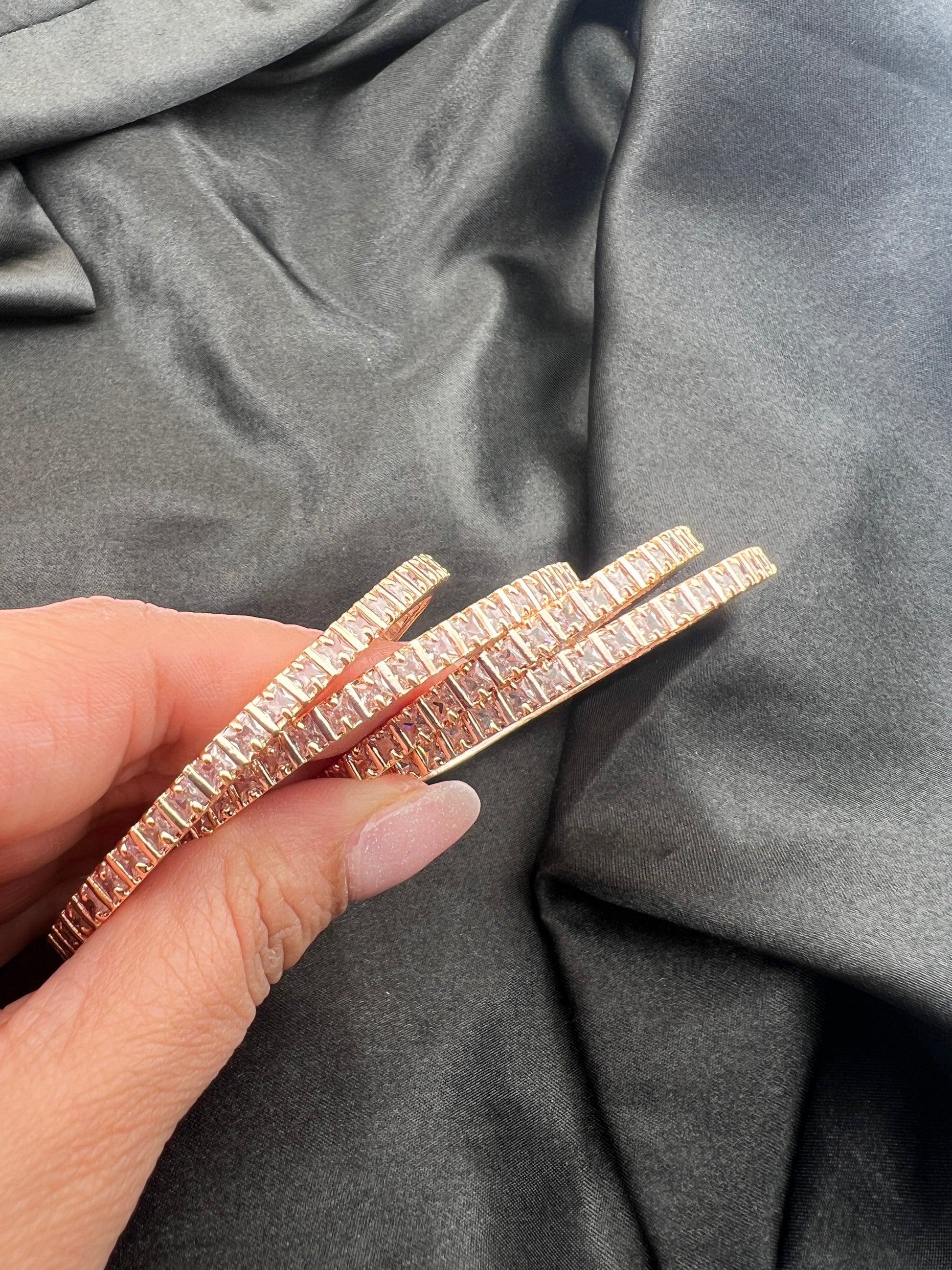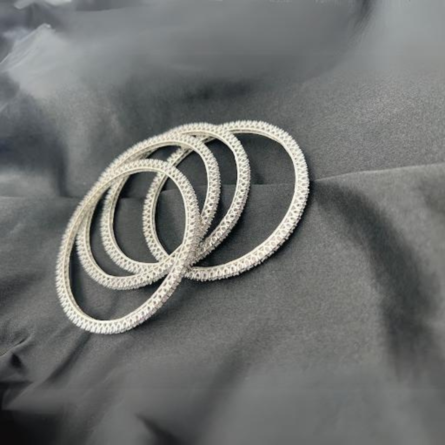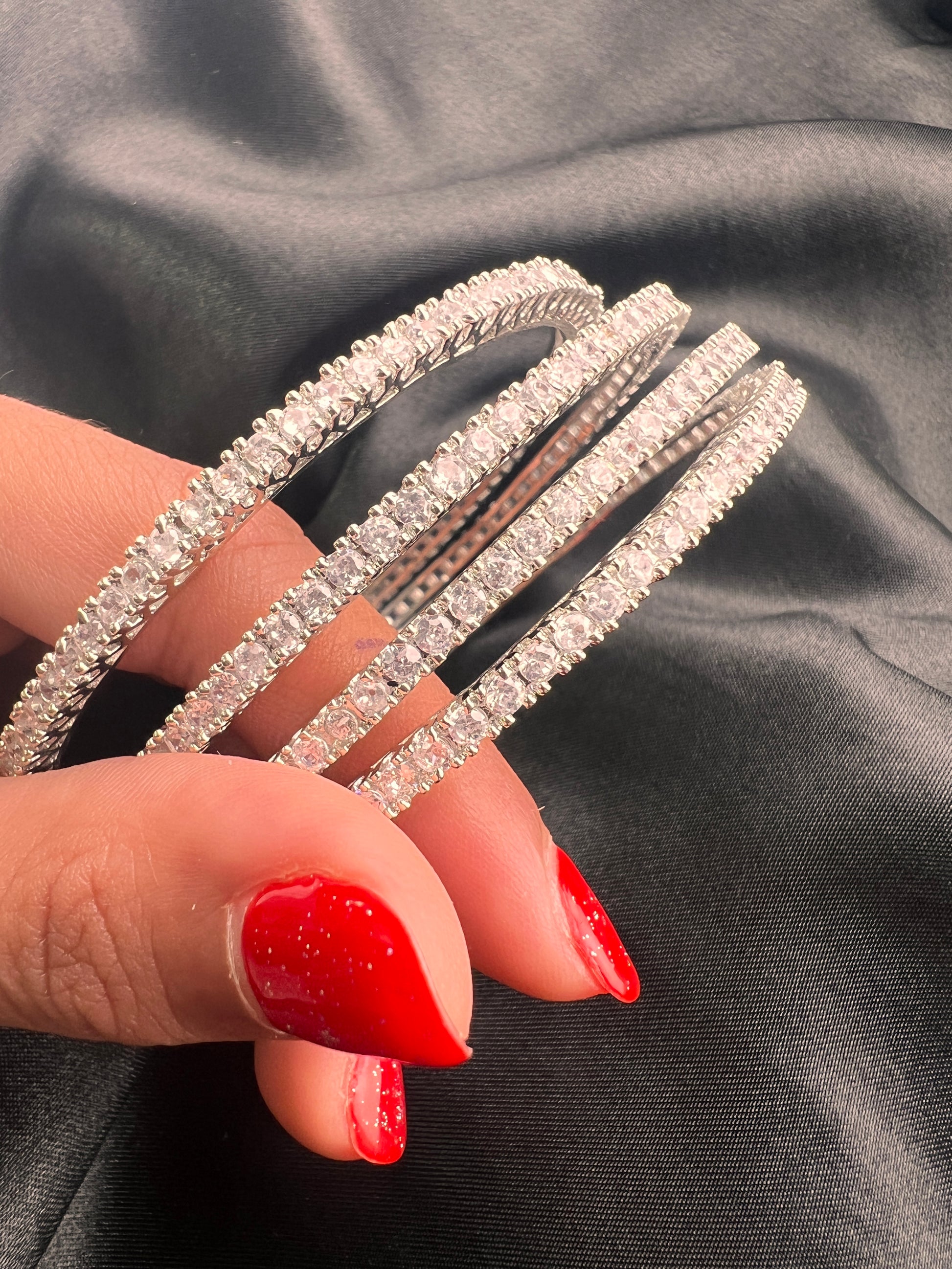 - Adorn your wrist with sophistication through this captivating bangle featuring radiant white gemstones in tennis bangle setting. It is meticulously crafted to emulate the sparkle of diamonds, adding a touch of refined elegance to each piece.